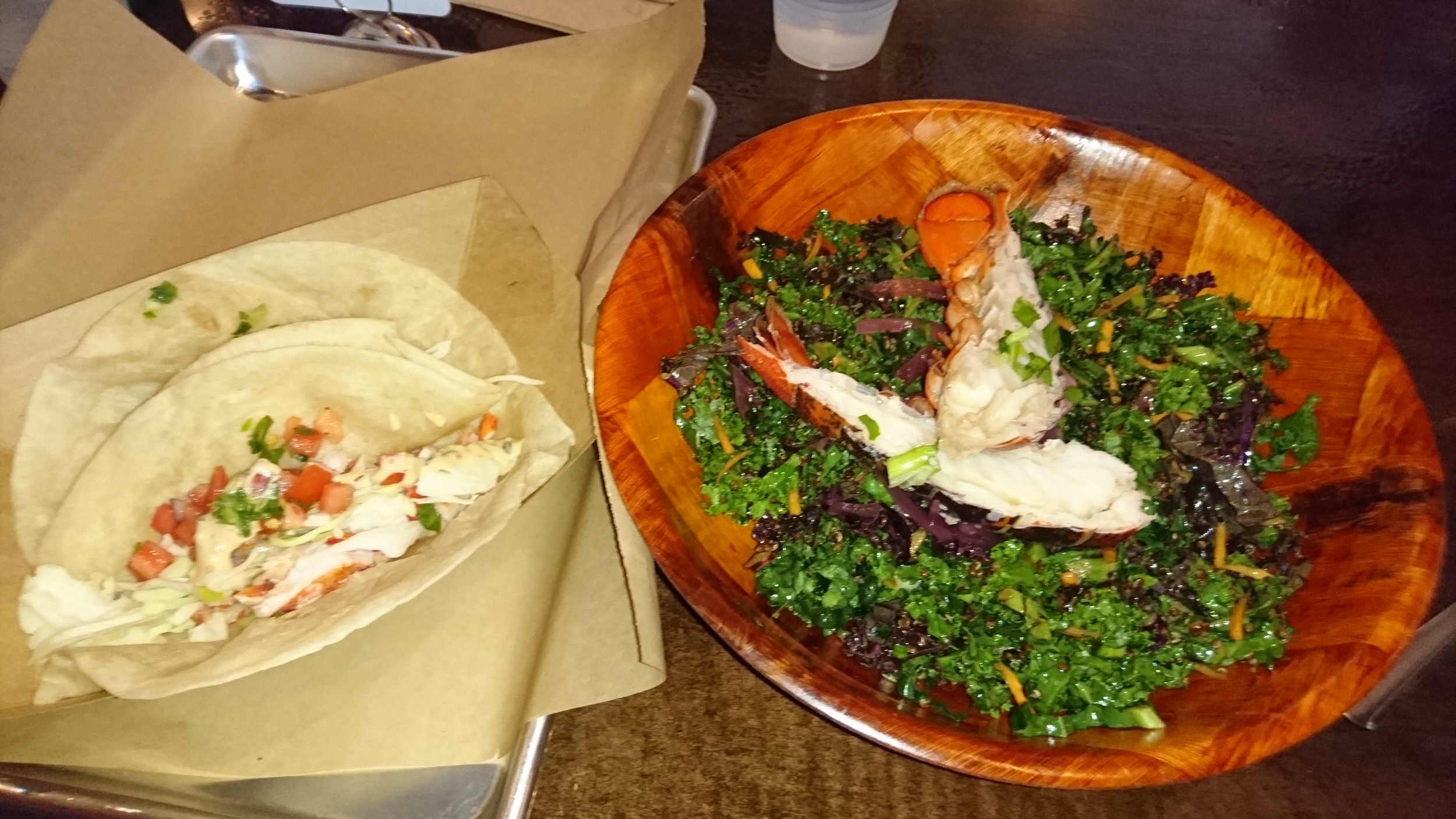 For my first visit, I sampled a range of menu items, including the lobster tacos ($11 for 2 – on flour tortilla not corn), Kale salad ($6 for salad, $16 if you add a lobster tail), lobster roll ($15 with a side of cole slaw), and, for those who don’t like lobster, the ahi poke bowl ($10).