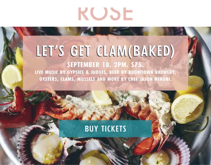 Summer never ends at The Rose, so come get CLAM(BAKED)! Join us for an afternoon of live music by Gypsies and Judges, seafood from Chef Jason Neroni, and craft beer from local favorite, Boomtown Brewery. The festivities will take place on the beer garden patio and includes all the essentials for a traditional New England- style clambake.